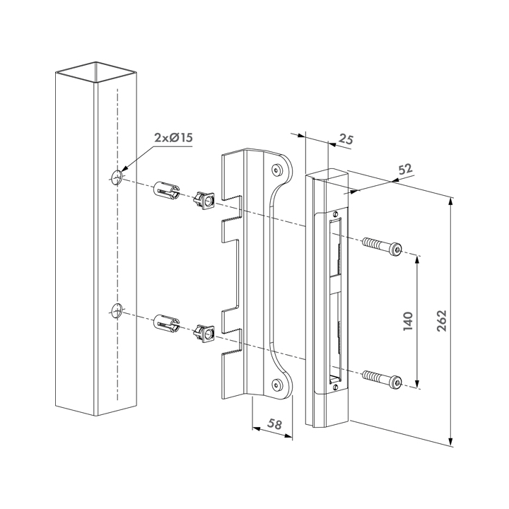 This surface-mounted keep features a sleek, modern design and is perfectly suited for use with Fortylock, Fiftylock, and Sixtylock insert locks. It is fully compatible with the Modulec-SF electric strike without the need for any modifications. Installation is quick and straightforward, requiring minimal gate preparation, while the Quick-Fix system ensures a fast, secure fit. Its robust anchoring provides long-lasting strength and reliable gate closure